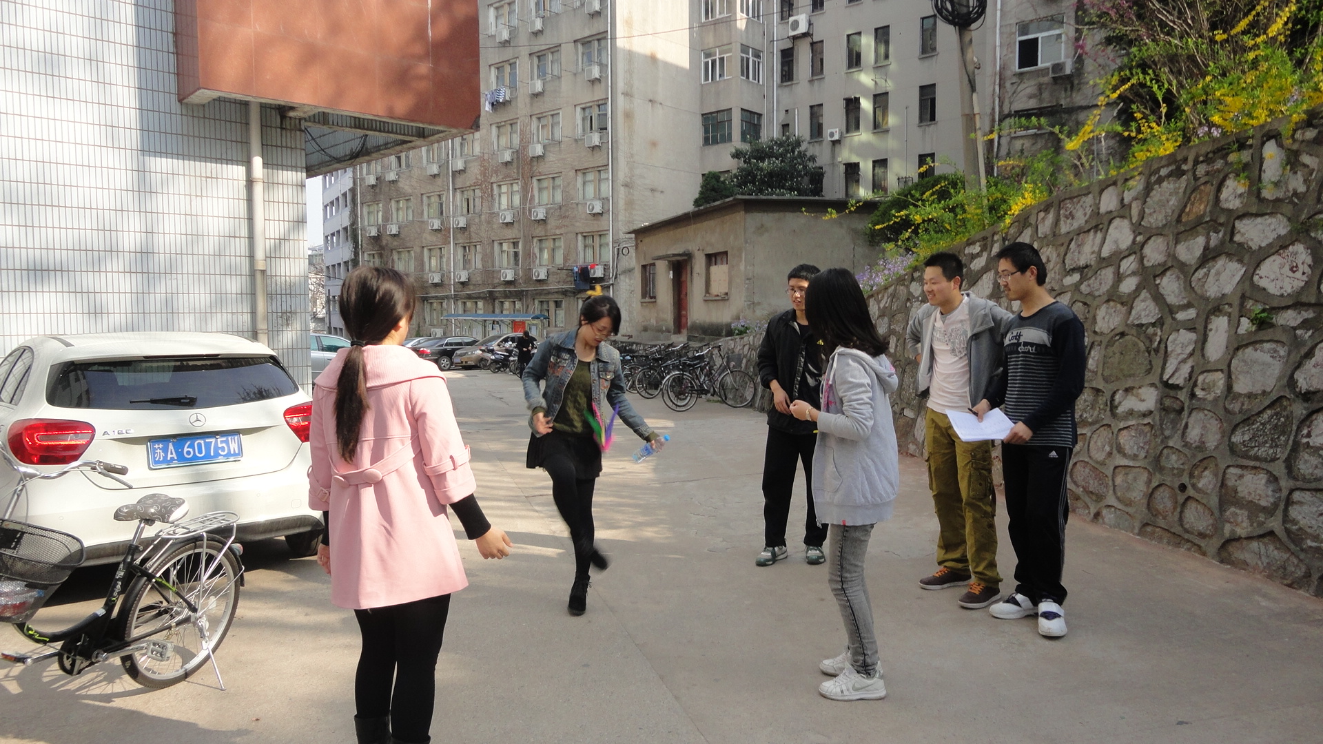 三点一刻,所有参赛同学从起点出发,带着灿烂的笑容开始奔跑。比赛设置七个签到点,每对四名参赛者到达每个签到点后都要完成一定的任务,才能继续跑向下一点。在友谊山庄门口,第一队到达的将加20秒的总时间,最后一队到达的则减少20秒的总时间,并拍照留念;在研综楼门口,每组要踢三下毽子,每人一下而且不能落地;在闻天馆门口,参赛者从五张分别写着减60秒、减30秒、不加不减、加30秒、加60秒的纸条中抽取一个;在河海馆门口,抽签答题,答对减30秒,答错加30秒;在校医院门口,每组派一名队员一口气喝下一瓶矿泉水,喝完的减90秒,否则加40秒;在北教学楼下,每组派两名队员头朝下、手朝下原地转10圈;在管理楼下,每组一名同学吹一个气球,并用双手捏爆。