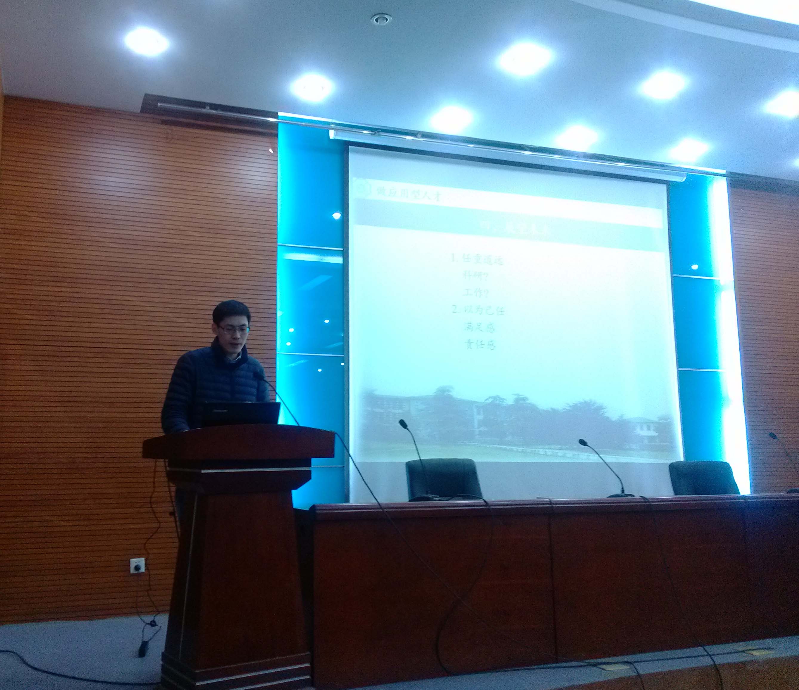 交流会在主持人杨杨阳简短的介绍后就开始了。董长龙、林俊雄和包子云三位优秀硕士研究生分别从自己的研究方向出发,分别介绍了《勇攀科研高峰,铸就科研品质》、《从就业角度对专利的重要性略谈一二》以及《如果有机会重新读研究生--从科研角度》三个目前我们研一、研二学生面临的困惑进行了细致的讲解,并对目前的一些研究进展进行了总结性的介绍,同时还分享了他们的科研思路、实验心得以及学习、生活的心路历程。